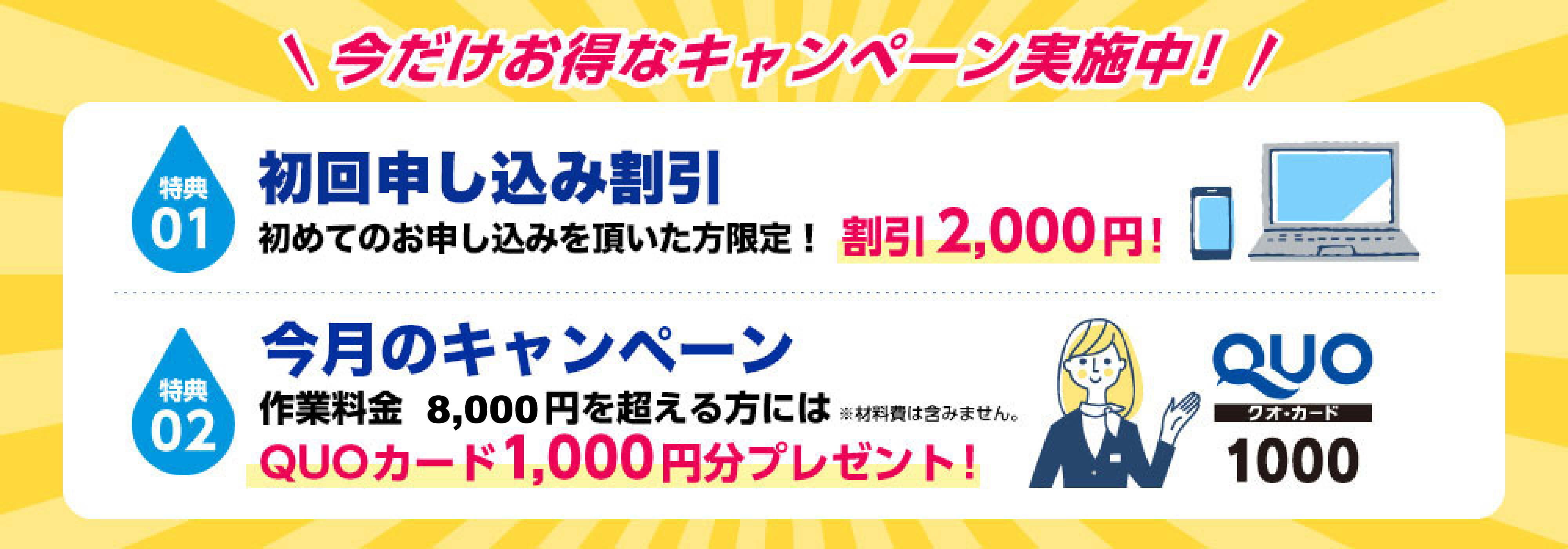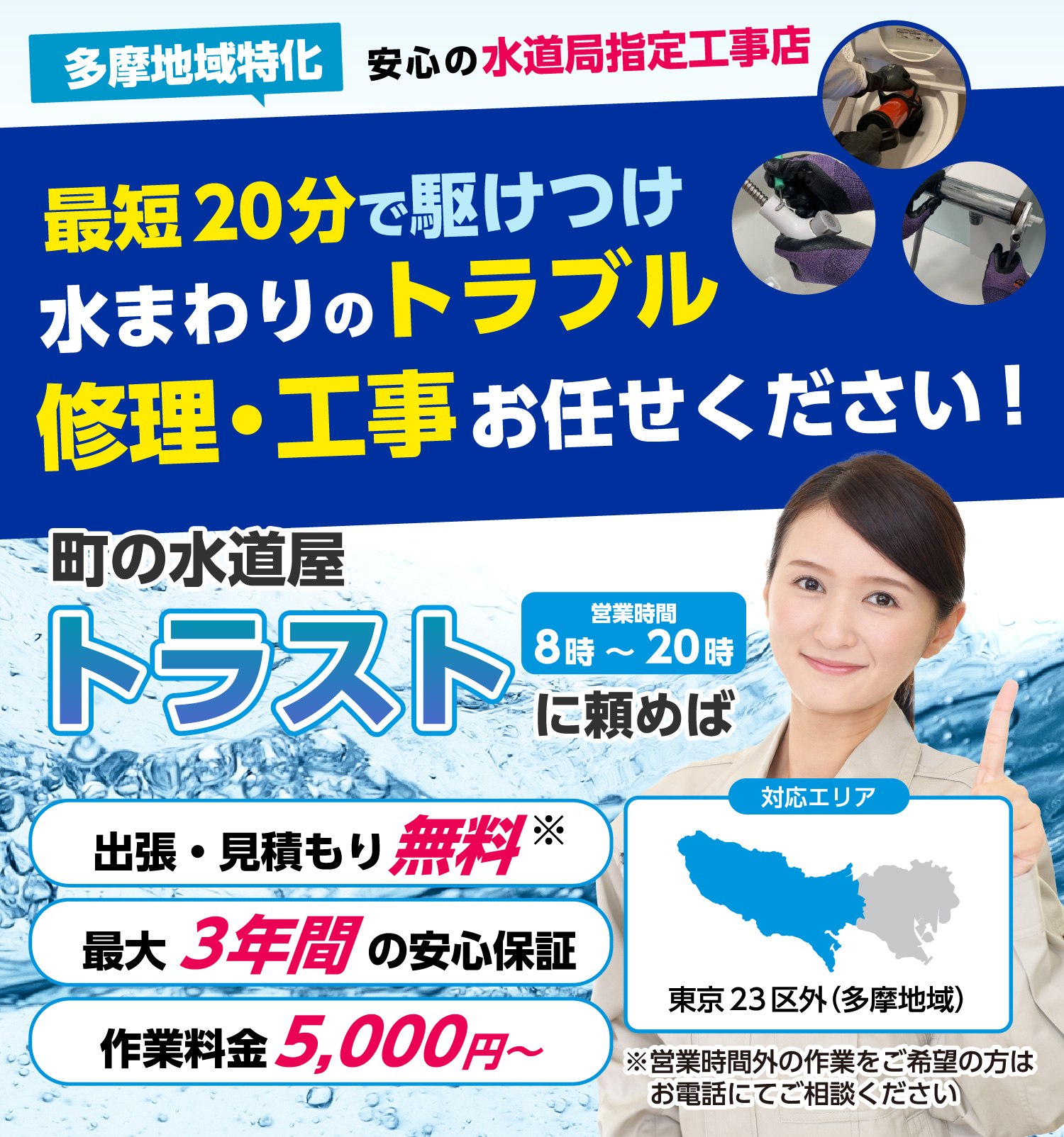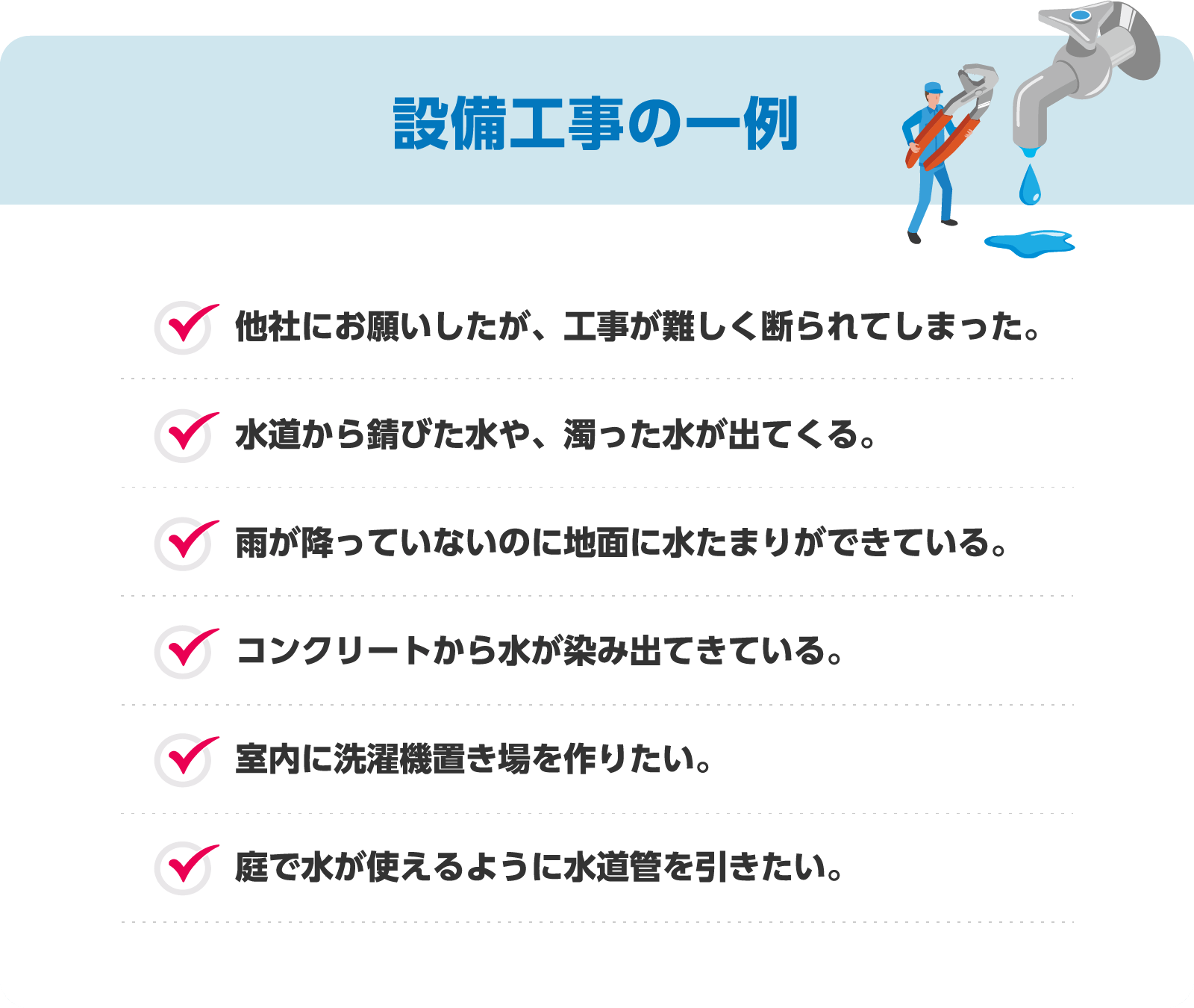 | 業務内容 | 水道トラブル修理全般、水廻り製品取付・交換、給湯器取付・交換、各種ポンプ交換、高圧洗浄作業、水廻りリフォーム工事全般、内装リフォーム工事全般、給排水設備工事全般 |